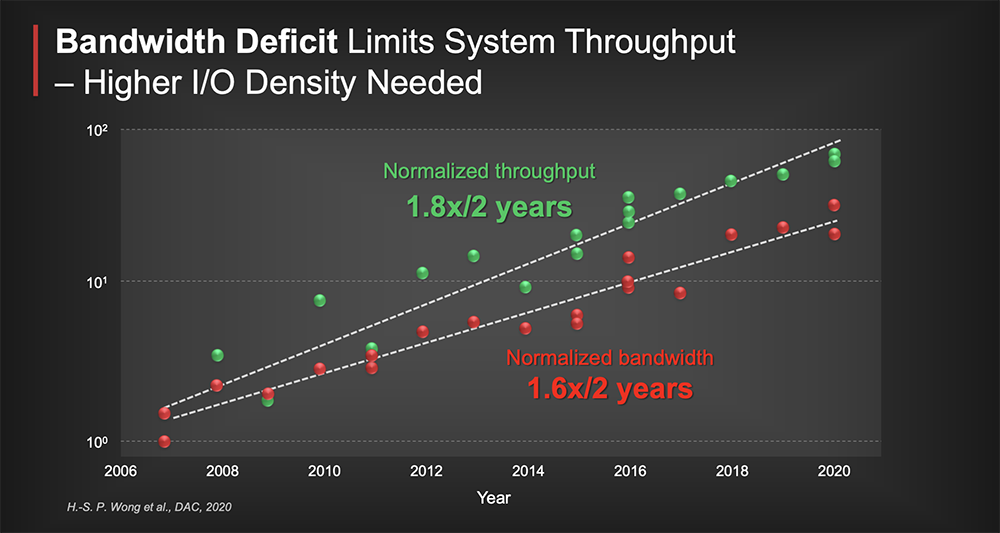 这里,增加芯片之间的I/O密度是增加峰值带宽和减少传输能耗的关键。