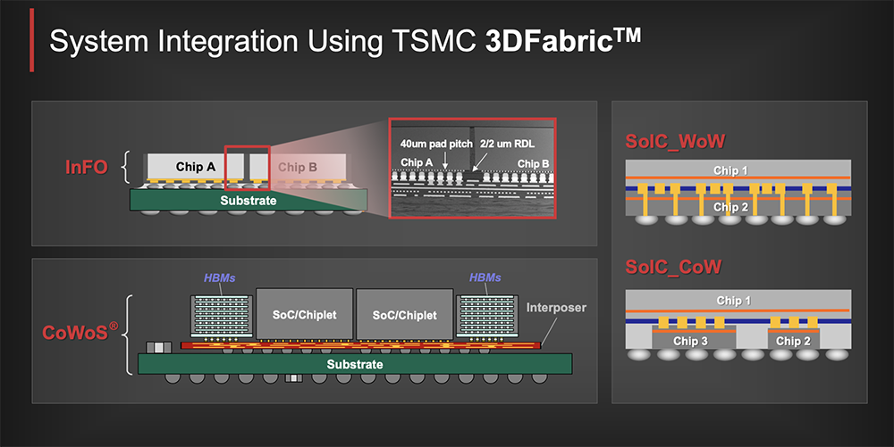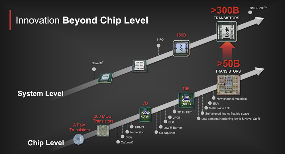 在系统层面,台积电的InFo、CoWoS、SoIC技术等多种解决方案,为封装系统的晶体管数量增加至3000亿开辟了道路。
