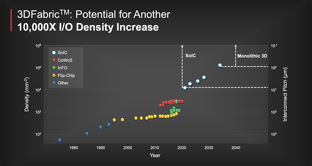 在过去的10年里,芯片互连密度快速发展,通过使用SoIC及其未来的扩展,包括单片三维集成、系统集成封装,密度有可能再提高10000倍。
