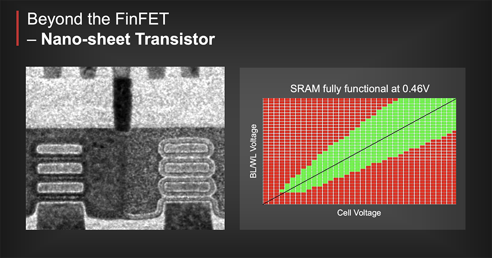 与前几代技术相比,纳米片晶体管实现了减少漏端引入的势垒降低(DIBL效应)和更好的亚阈值摆幅(subthreshold swing),以提高电路性能,为SRAM带来更低的供电电压,可提供0.46V的可靠快取操作。