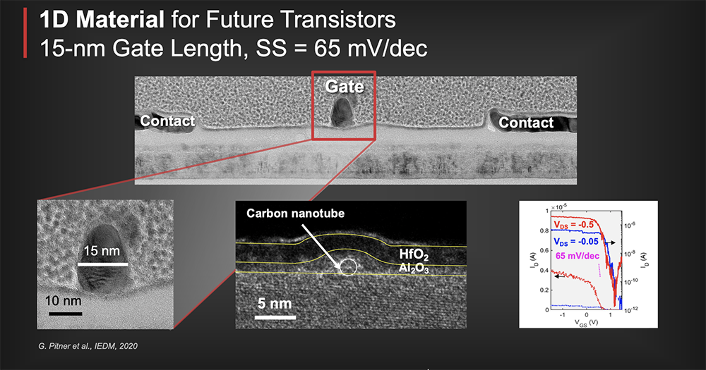 碳纳米管(CNT)也是未来晶体管的潜在候选者之一。台积电两个月前在IEDM上发表的一篇论文展示了其在碳纳米管沟道上的突破。台积电研发了独特的工艺流程来为碳纳米管提供high-K电介质等效栅极氧化物,适合于10nm栅极长度的晶体管。