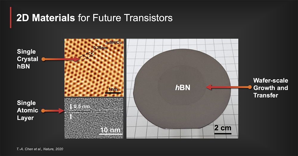 据刘德音了解,低维材料近年来已经取得了重大突破。例如,台积电与多家学术团队合作成功地在2英寸晶圆衬底上外延生长单晶六方氮化硼(hBN)单层薄膜。这项研究发表在2020年3月的国际学术期刊《自然》上。